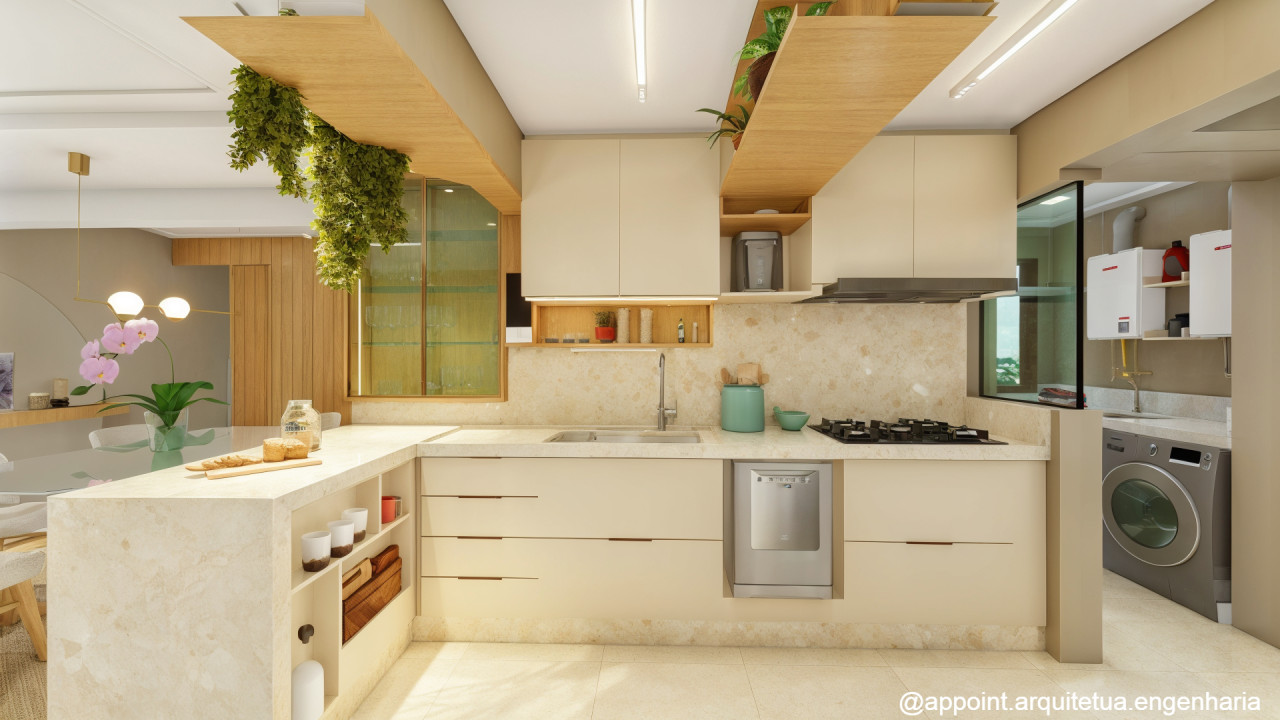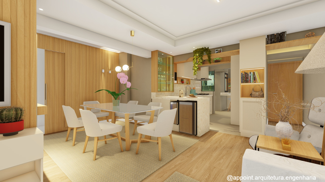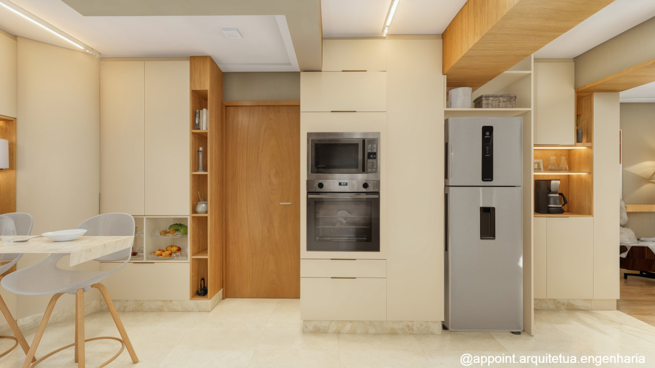 Reforma de um apartamento residencial integrando a cozinha com a sala com cores monocromáticas em tons de bege.