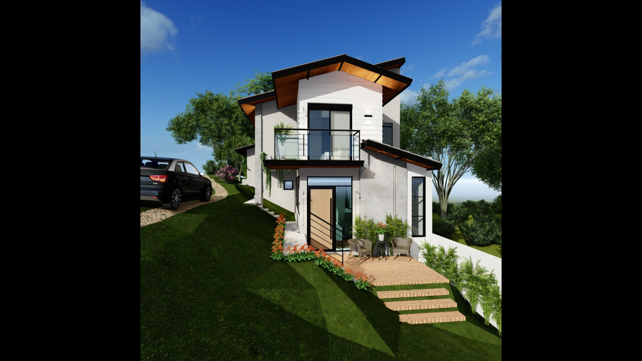 Uma casa em um terreno com declive bem acentuado, com estilo de fachada americana e aproveitamento do desnivelamento para diferentes pavimentos da casa. Área construída de 152,28m² - Projeto de Arquitetura e Engenharia - 2025