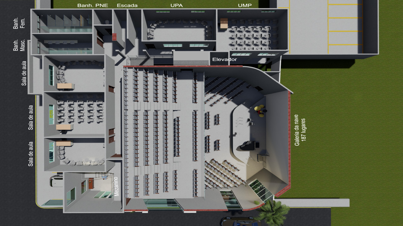 Reforma do complexo da Igreja Presbiteriana em Barreiras - BA com construção de novo templo e adaptação dos ambientes existentes transformando em salão social, s,alas de aula e ambientes de apoio. Complexo com 1.068,30m². Projeto de arquitetura - 2024