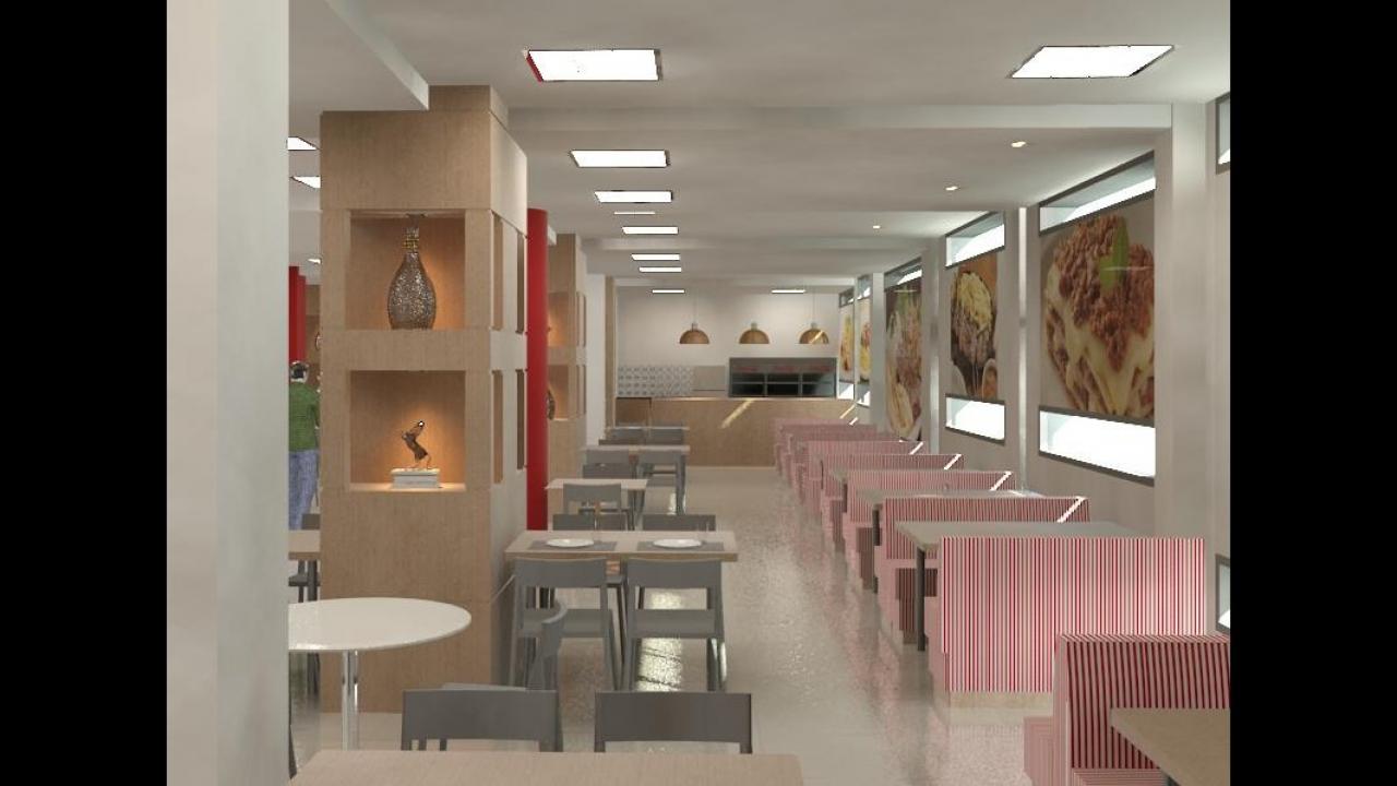 Um charmoso projeto para um restaurante na Galeria GG com painéis visuais e cores vibrantes. Projeto de interiores - 2016