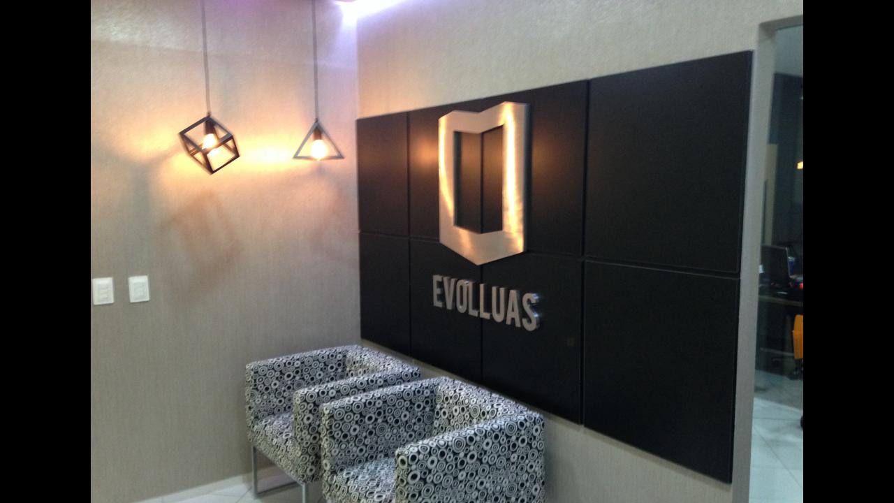 Recepção do escritório da Construtora Evolluas, com um painel charmoso e iluminação especial. Projetos de interiores - 2016