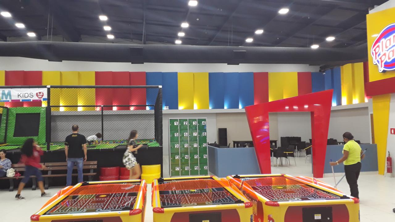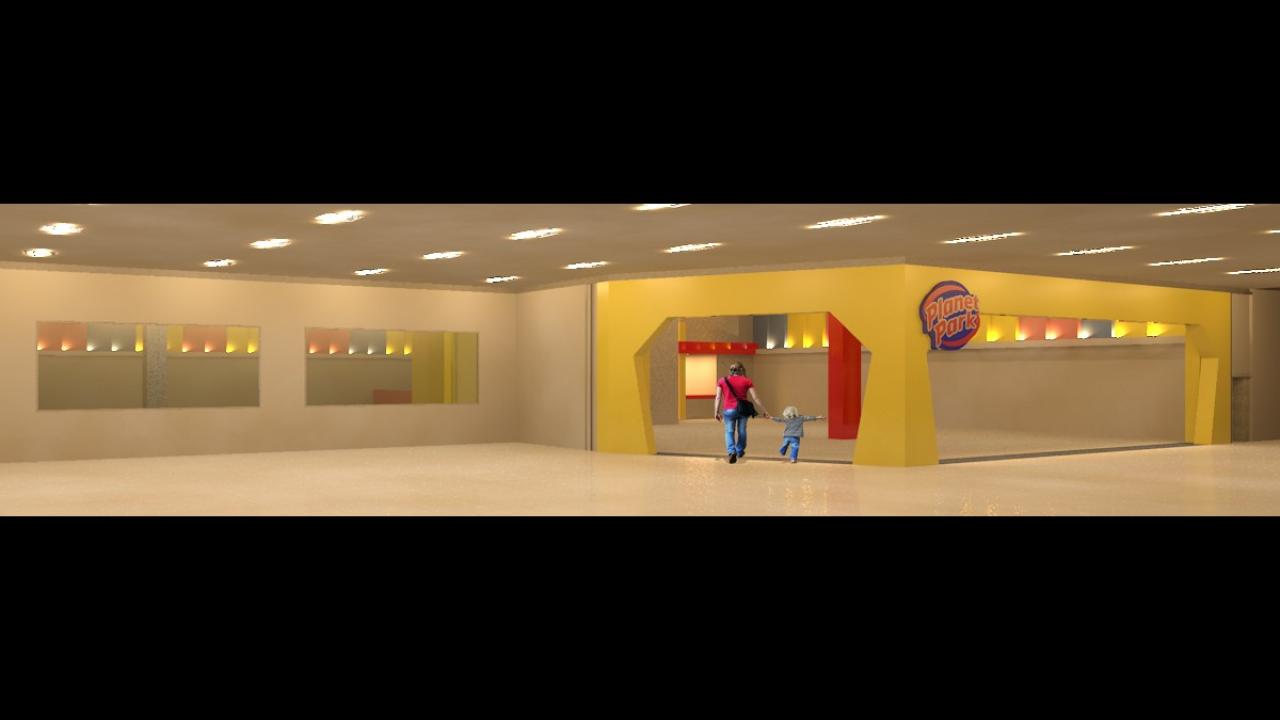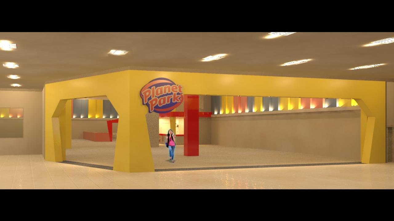 Loja da Planet Park para o Shopping Estação com 928,83m², com cores vibrantes e pórtico de entrada em ACM amarelo. Projetos de arquitetura e engenharia - 2017