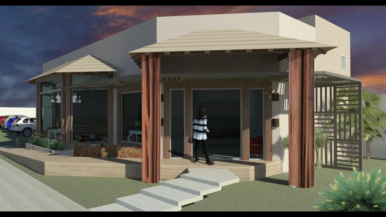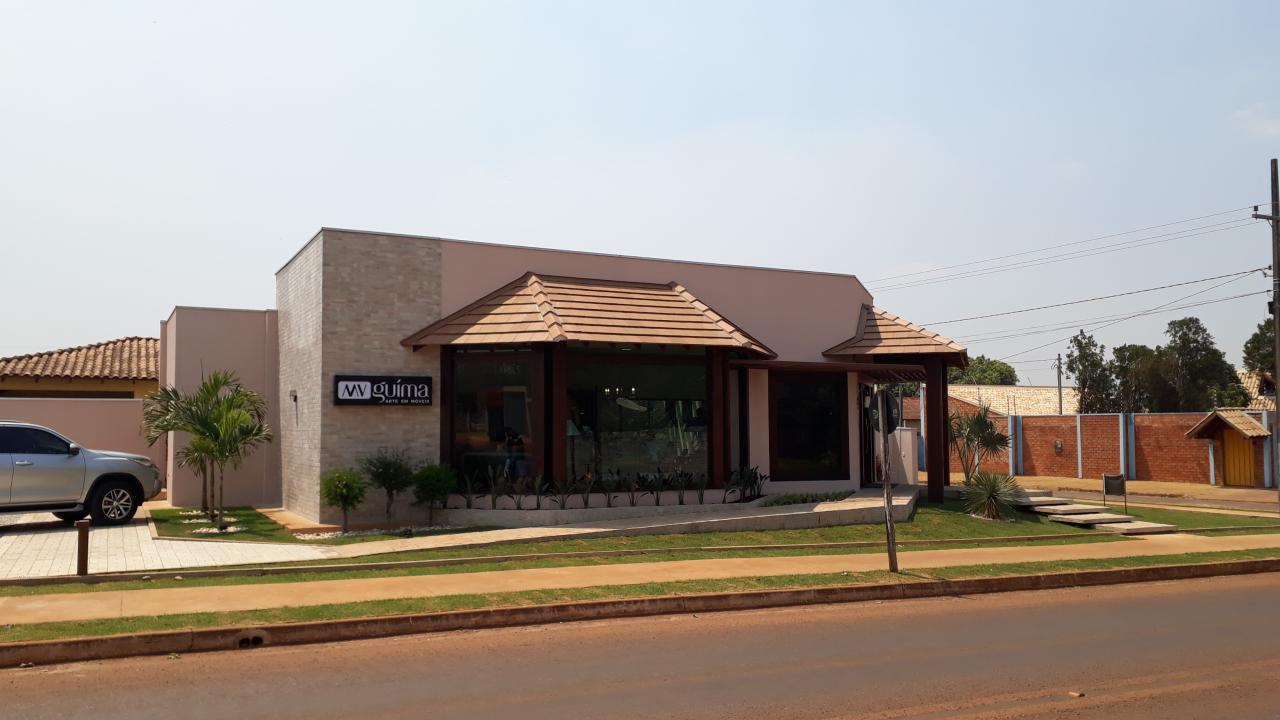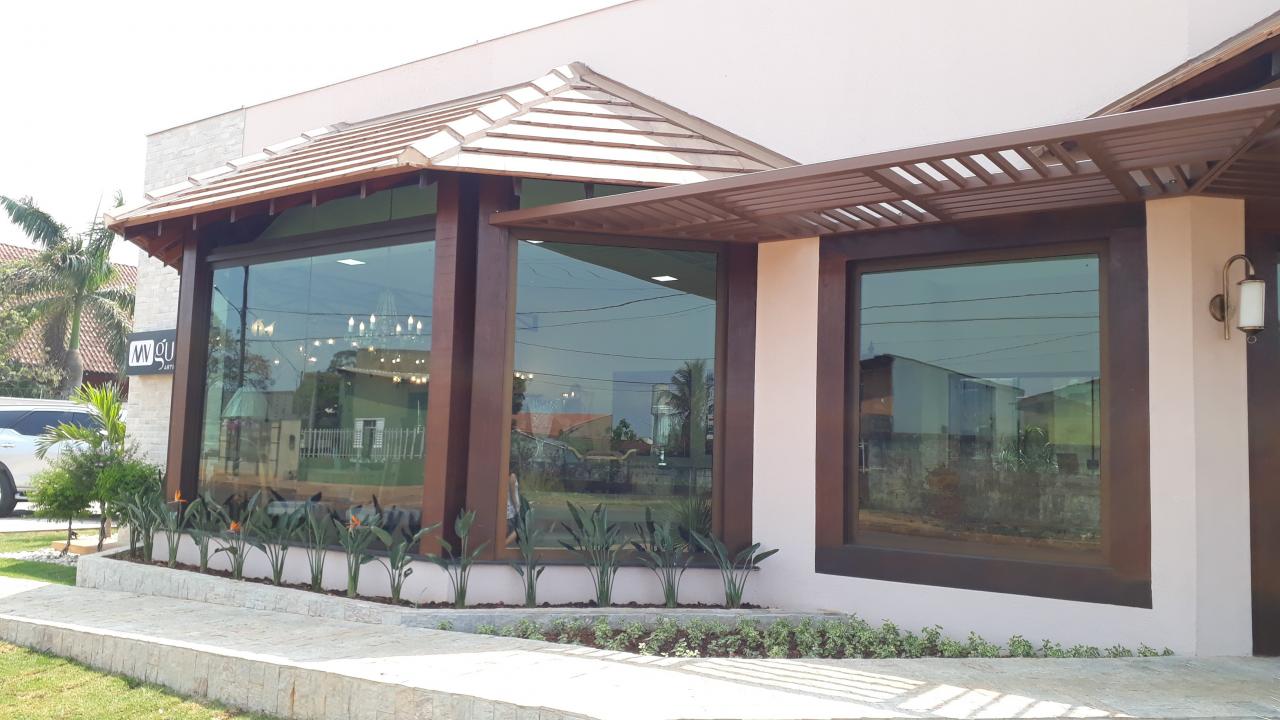 A MVGuima é uma loja de fabricação de móveis em marchetaria que fizemos o projeto. A fachada apresneta uma bay window (vitrine externa) com telha plana e esquadrias e pilares de madeira. Projetos de arquitetura e engenharia - 2018