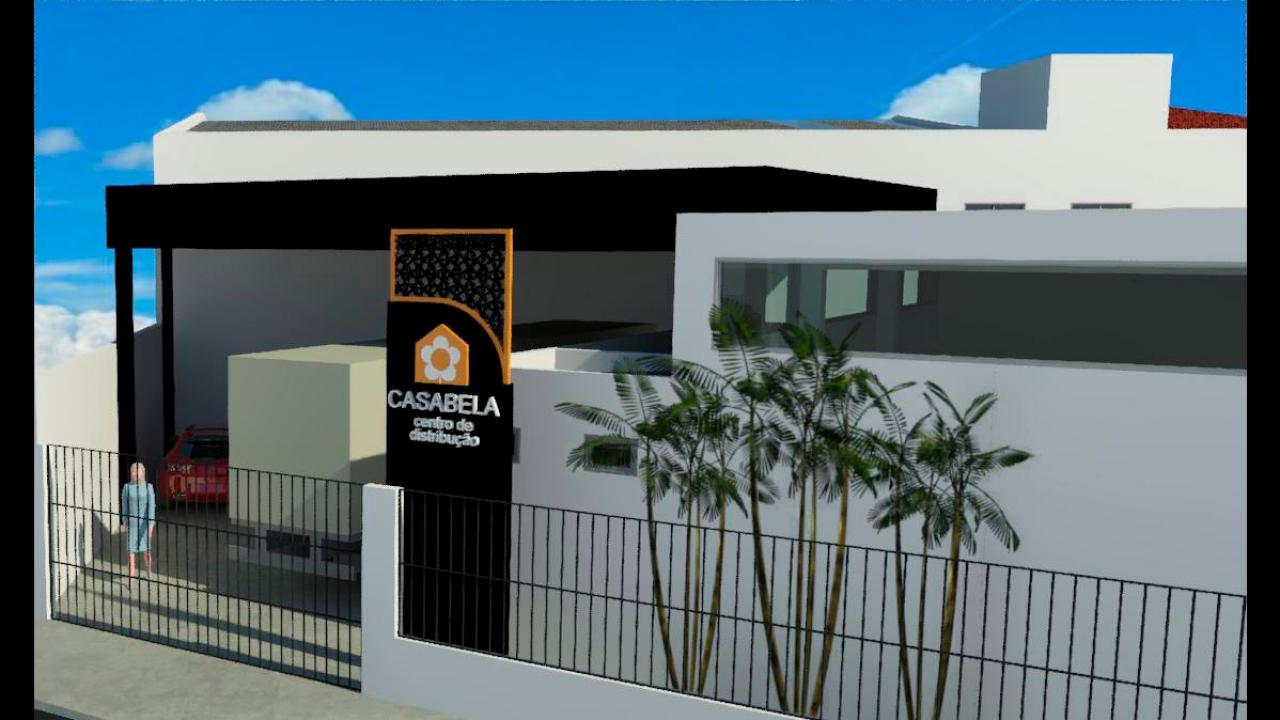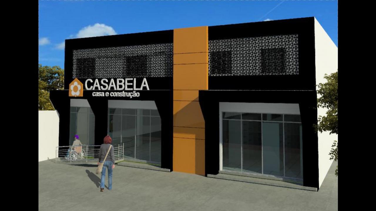 Retrofit da fachada da loja de materiais para construção Casa Bela, com aplicação de painel recortado em ACM preto e laranja. Projeto de arquitetura - 2018