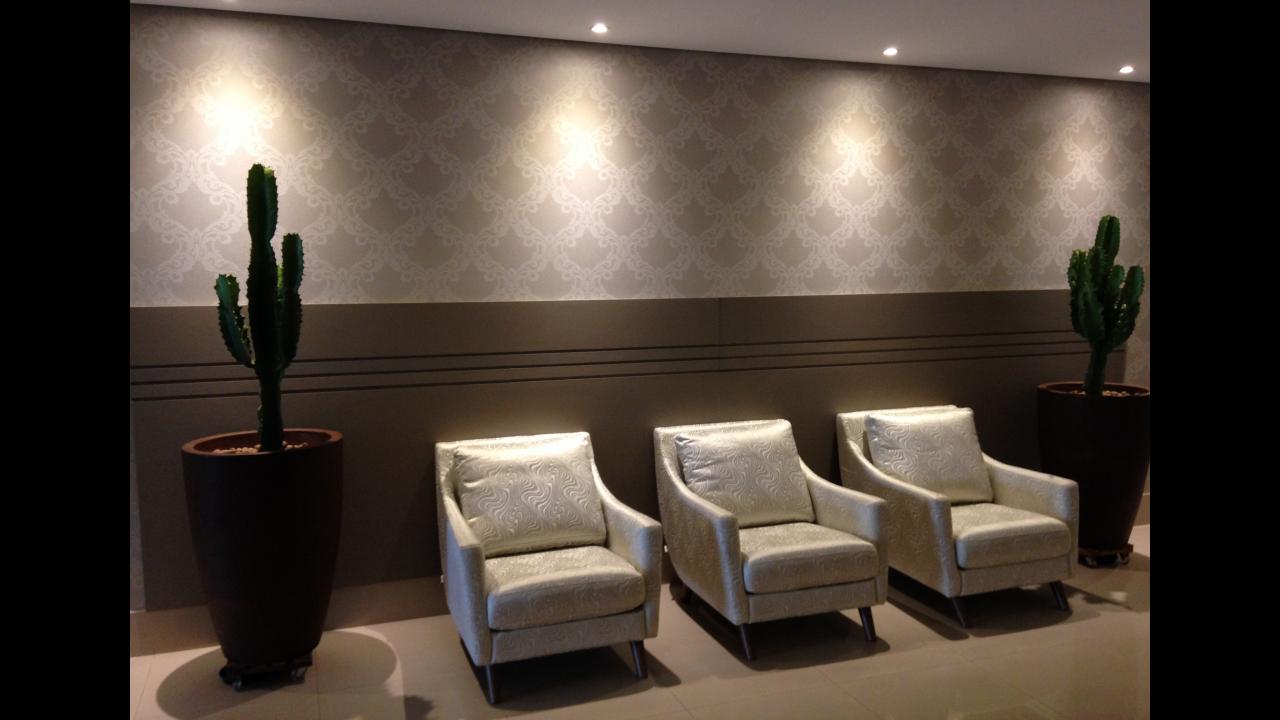 Decoração do hall de entrada e espaço gourmet do Edifício Jardim d'América com escolha de móveis, revestimentos e objetos decorativos. Projeto de interiores - 2015