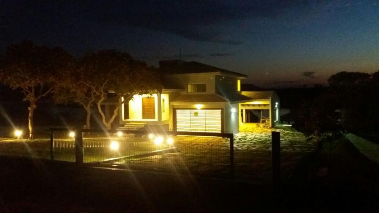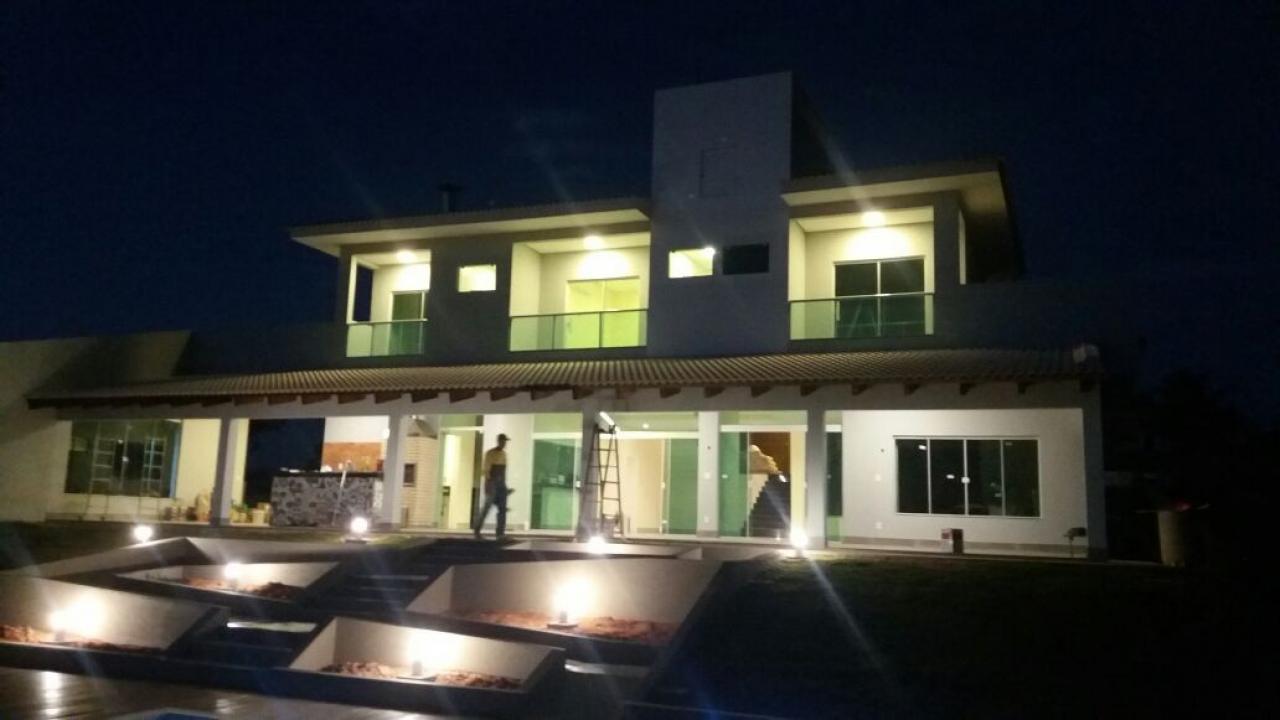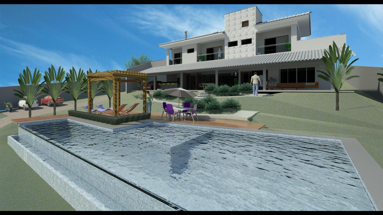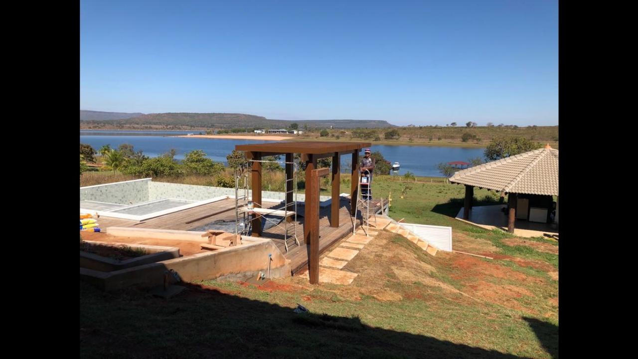 Uma casa de campo com 465,28m² de área construída elevada no terreno e uma linda piscina com borda infinita. As varandas na parte posterior da casa integram a natureza do condomínio náutico na região do Manso-MT. Projetos de arquitetura e engenharia - 2016