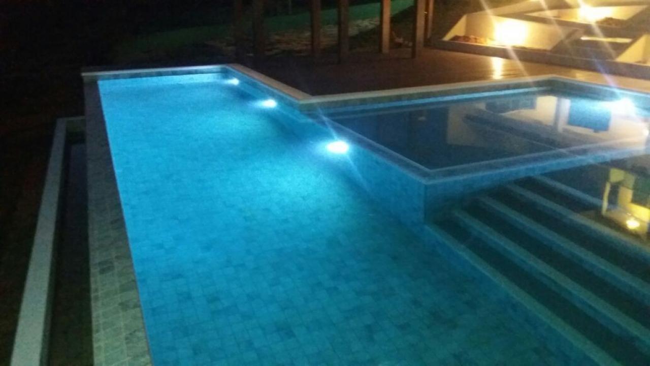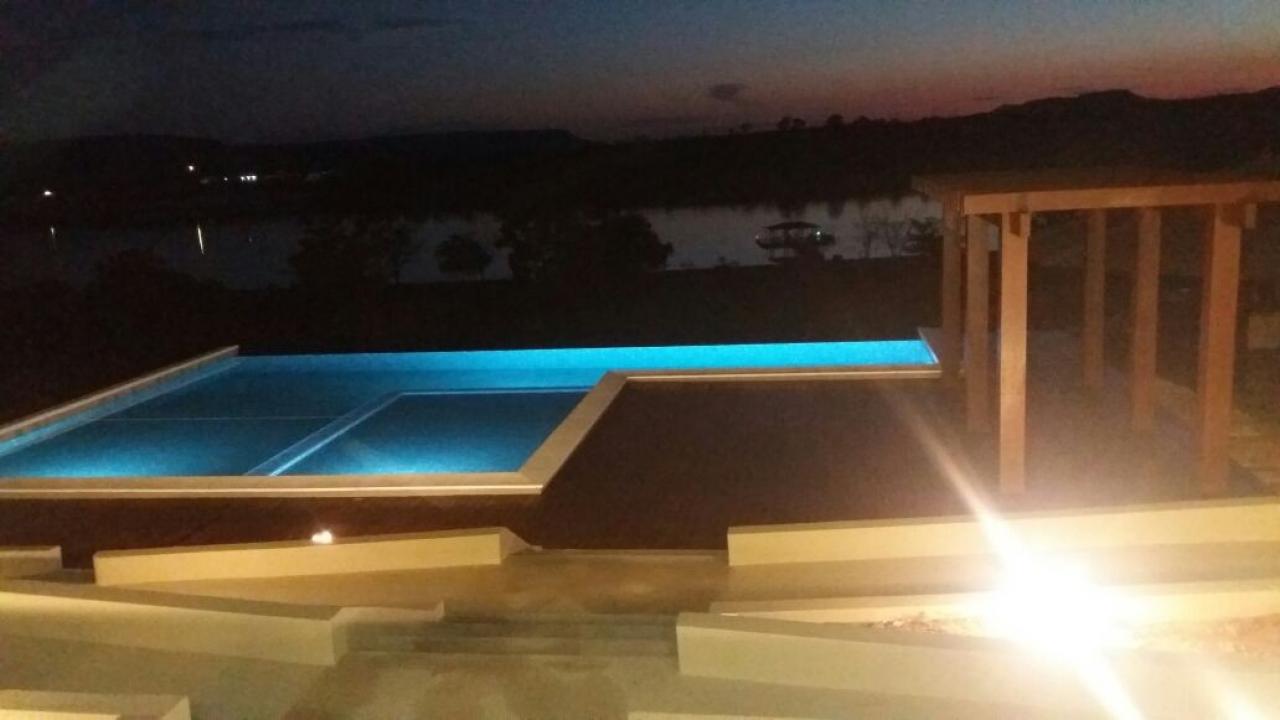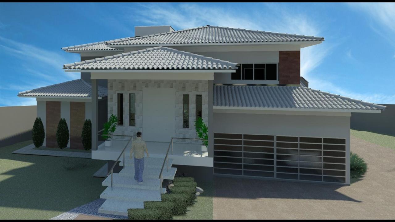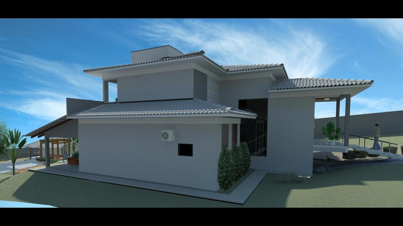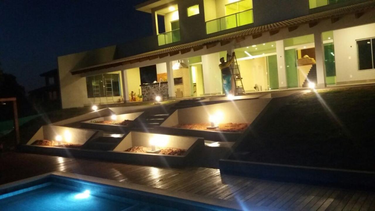 Uma casa de campo com 465,28m² de área construída elevada no terreno e uma linda piscina com borda infinita. As varandas na parte posterior da casa integram a natureza do condomínio náutico na região do Manso-MT. Projetos de arquitetura e engenharia - 2016