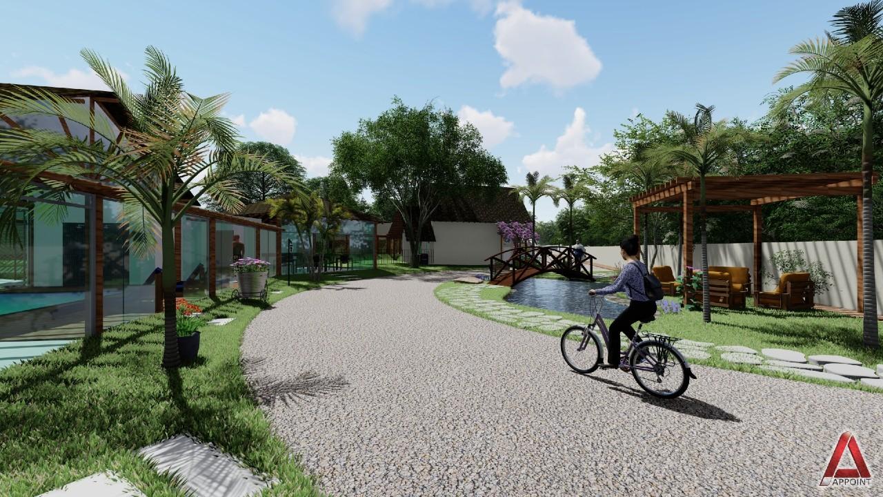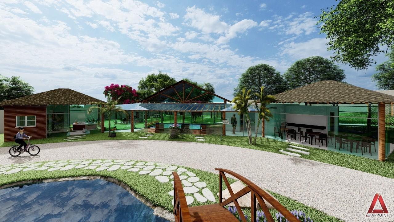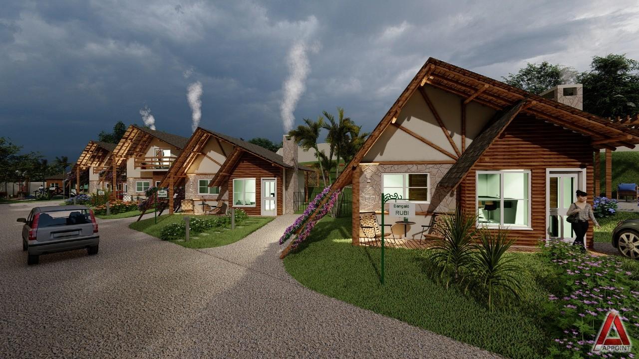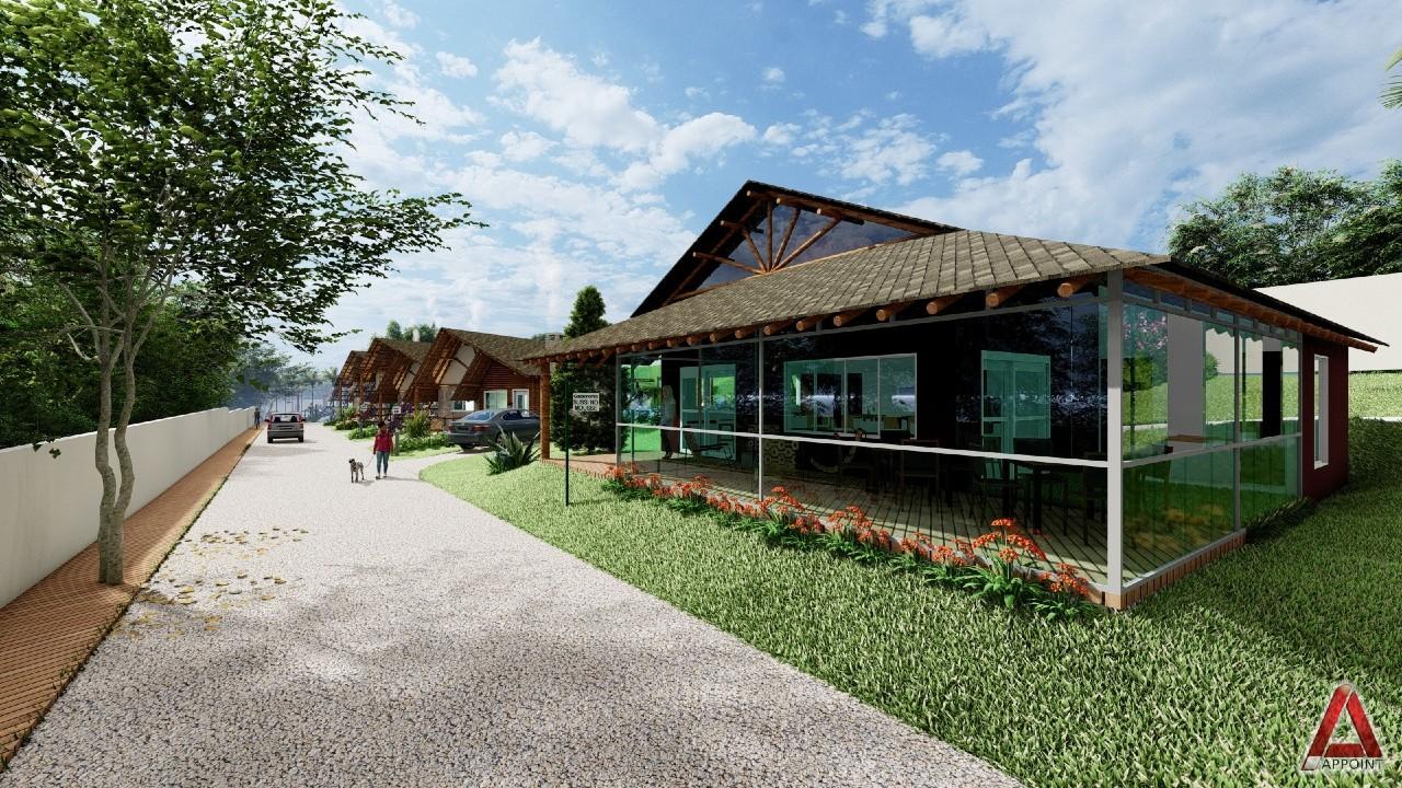 Um charme de pousada. Projeto para São José dos Pinhais-PR com 4 bangalôs, espaço gastronomia, duas praças deliciosas e área de lazer com piscina coberta, spa, sala de massagem, quiosque com churrasqueira, pista de caminhada, lago, cesta de basquete e muito paisagismo. Projeto de arquitetura - 2022