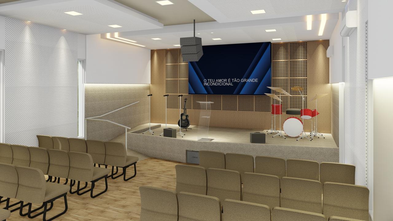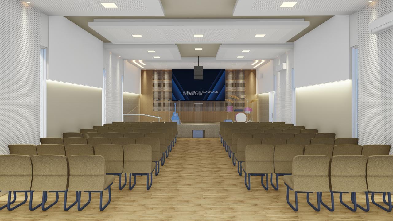 Projeto de retrofit de fachada e acabamentos internos com proposta de condicionamento acústico. Projeto de arquitetura - 2024