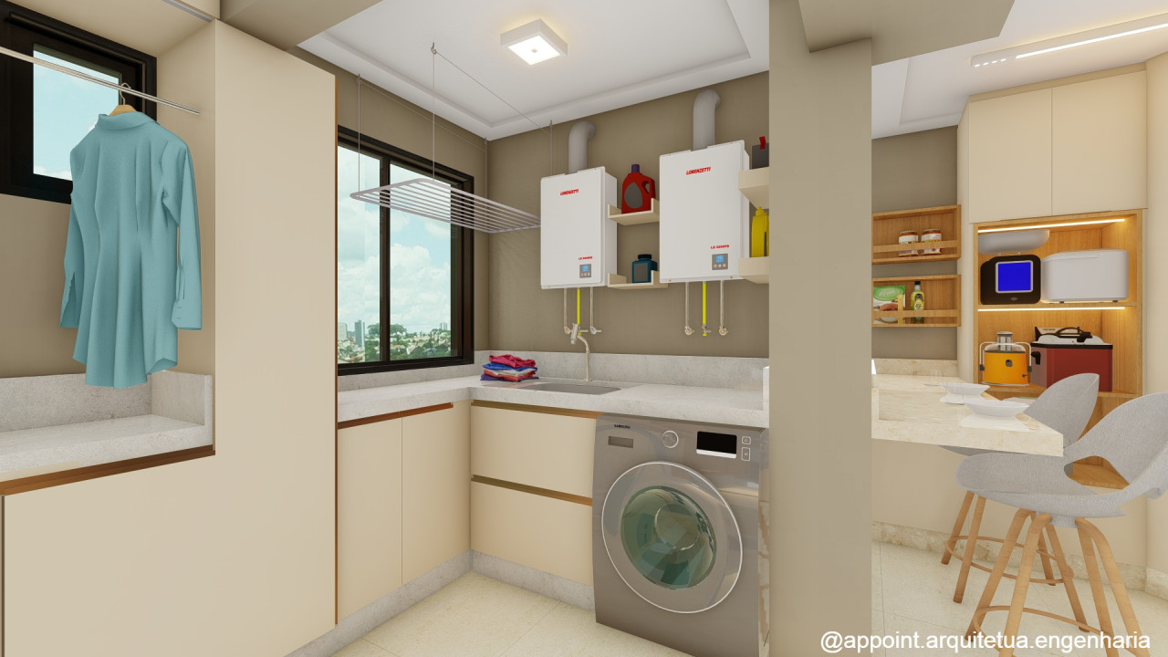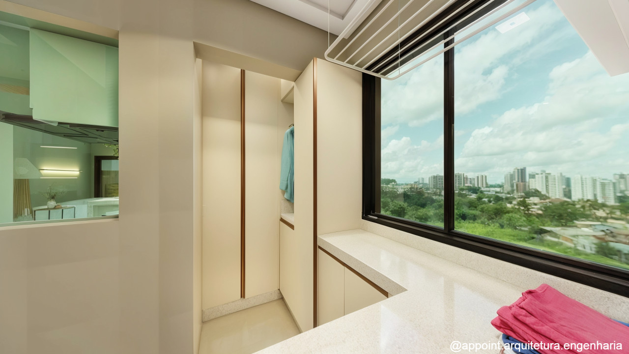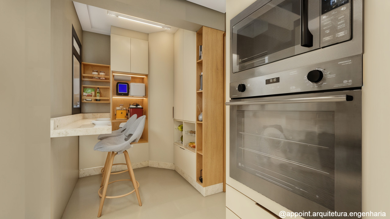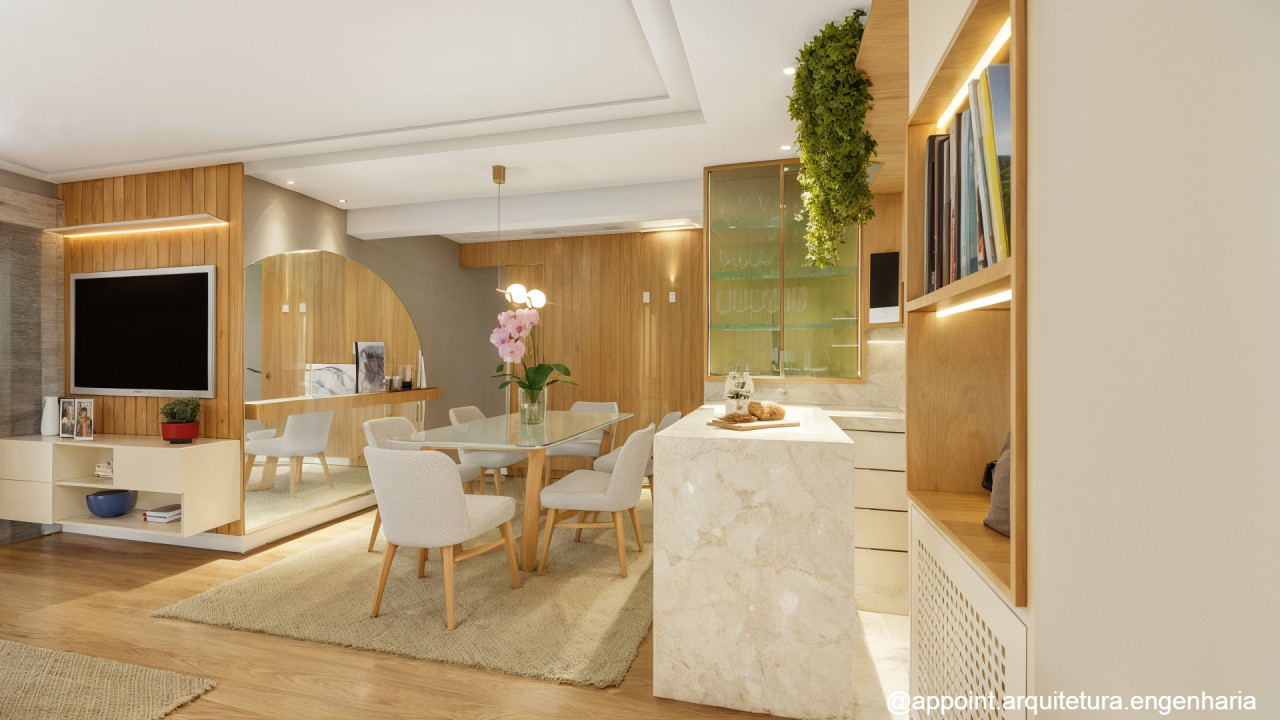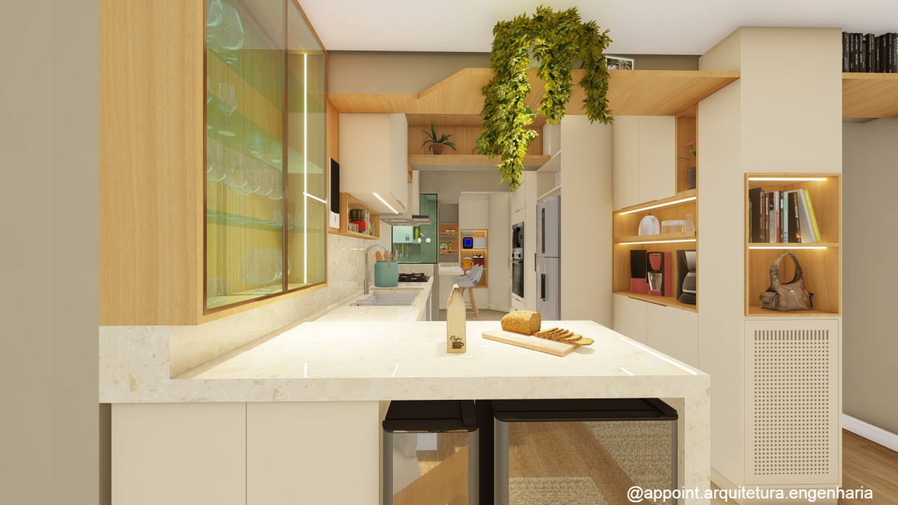 Reforma de um apartamento residencial integrando a cozinha com a sala com cores monocromáticas em tons de bege.