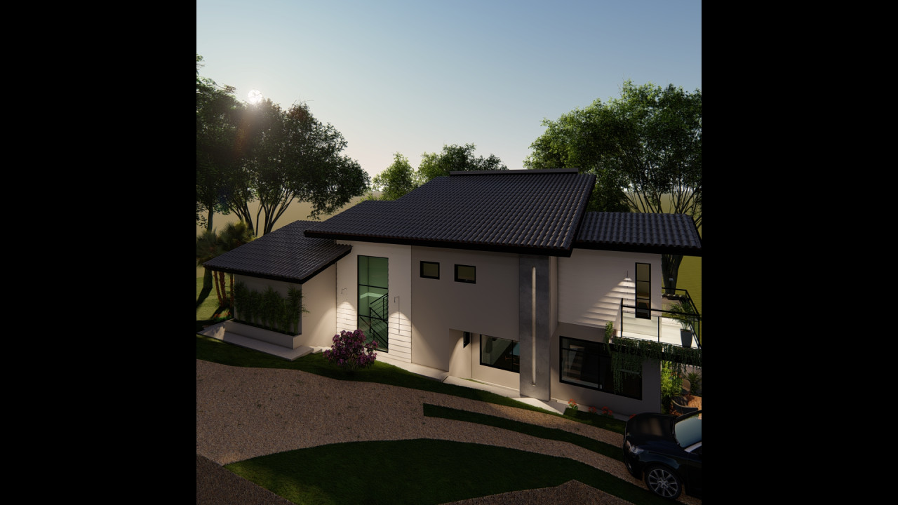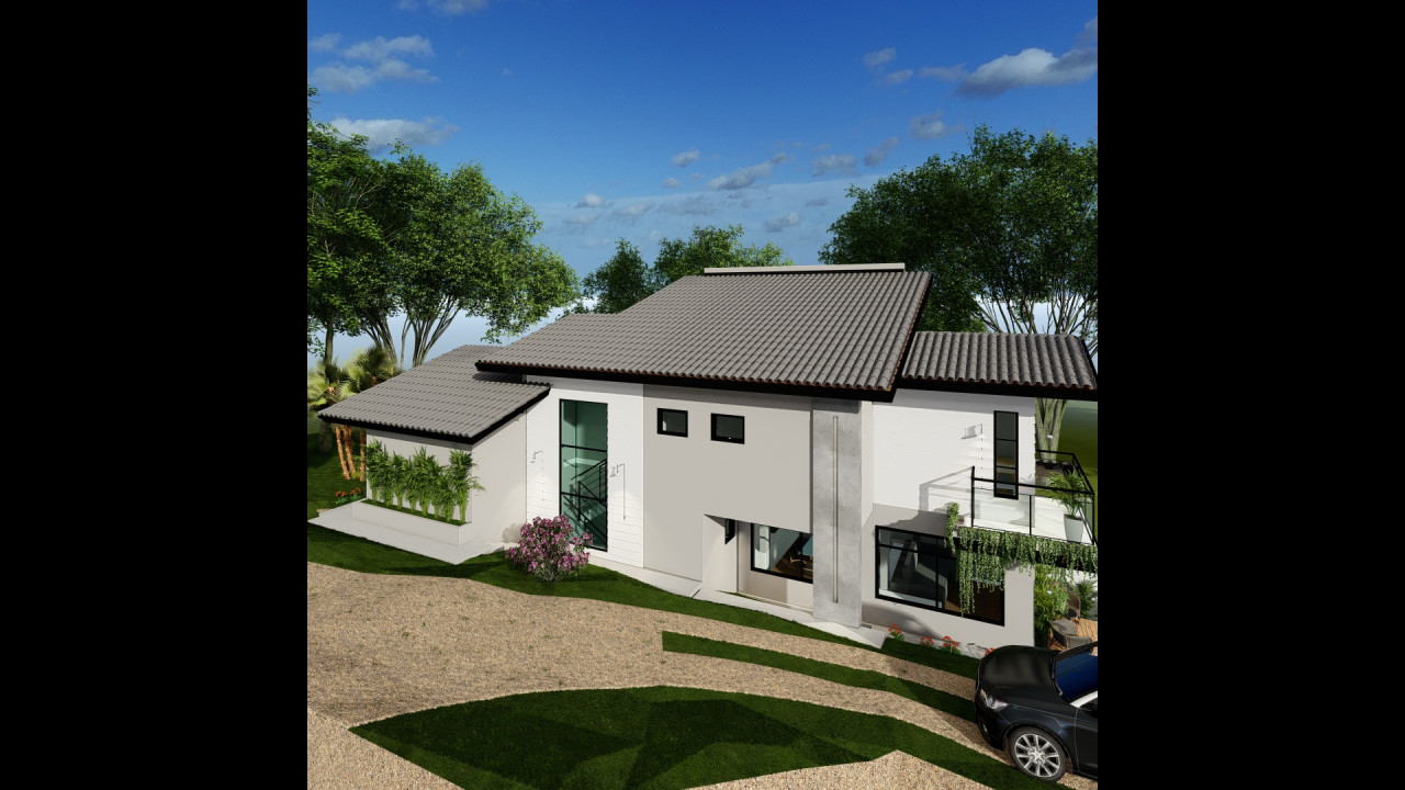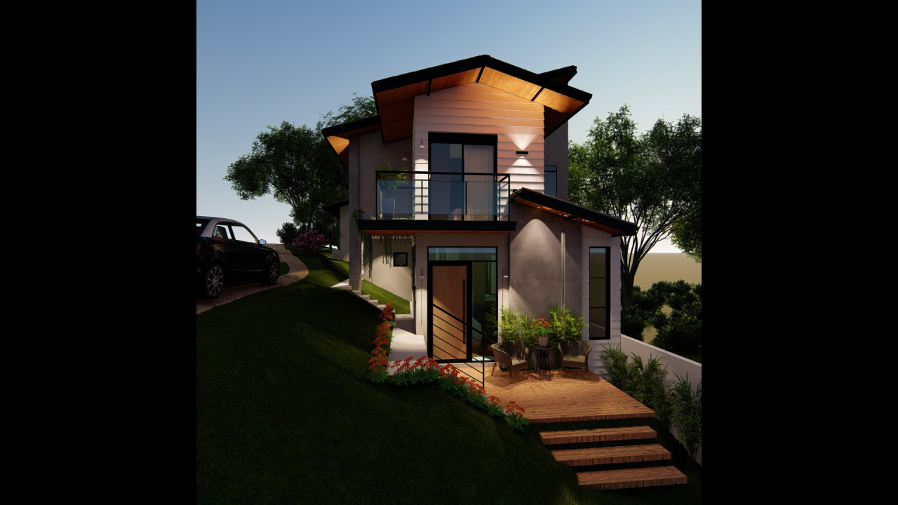 Uma casa em um terreno com declive bem acentuado, com estilo de fachada americana e aproveitamento do desnivelamento para diferentes pavimentos da casa. Área construída de 152,28m² - Projeto de Arquitetura e Engenharia - 2025