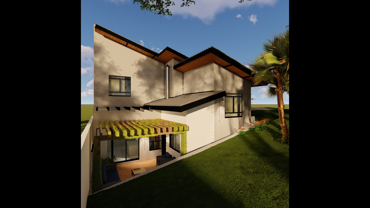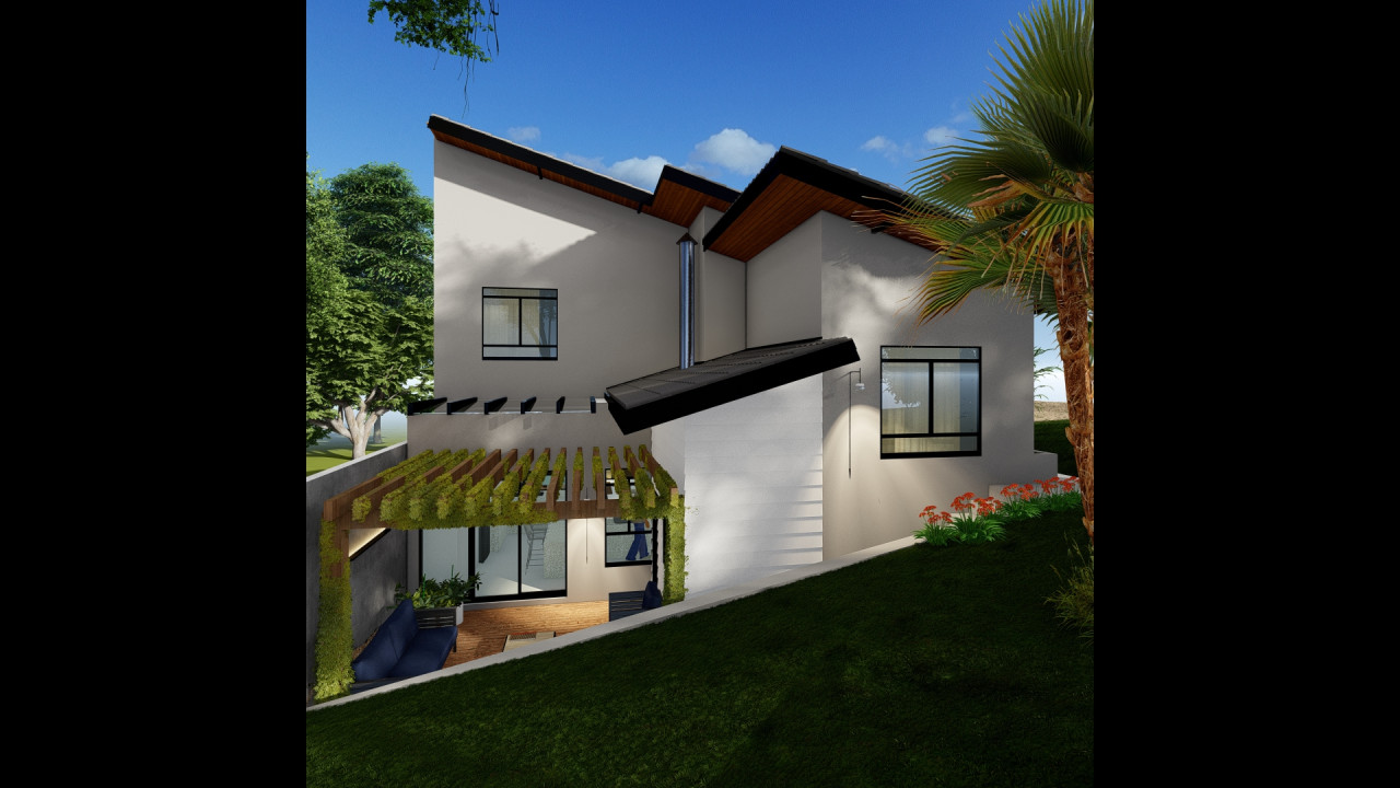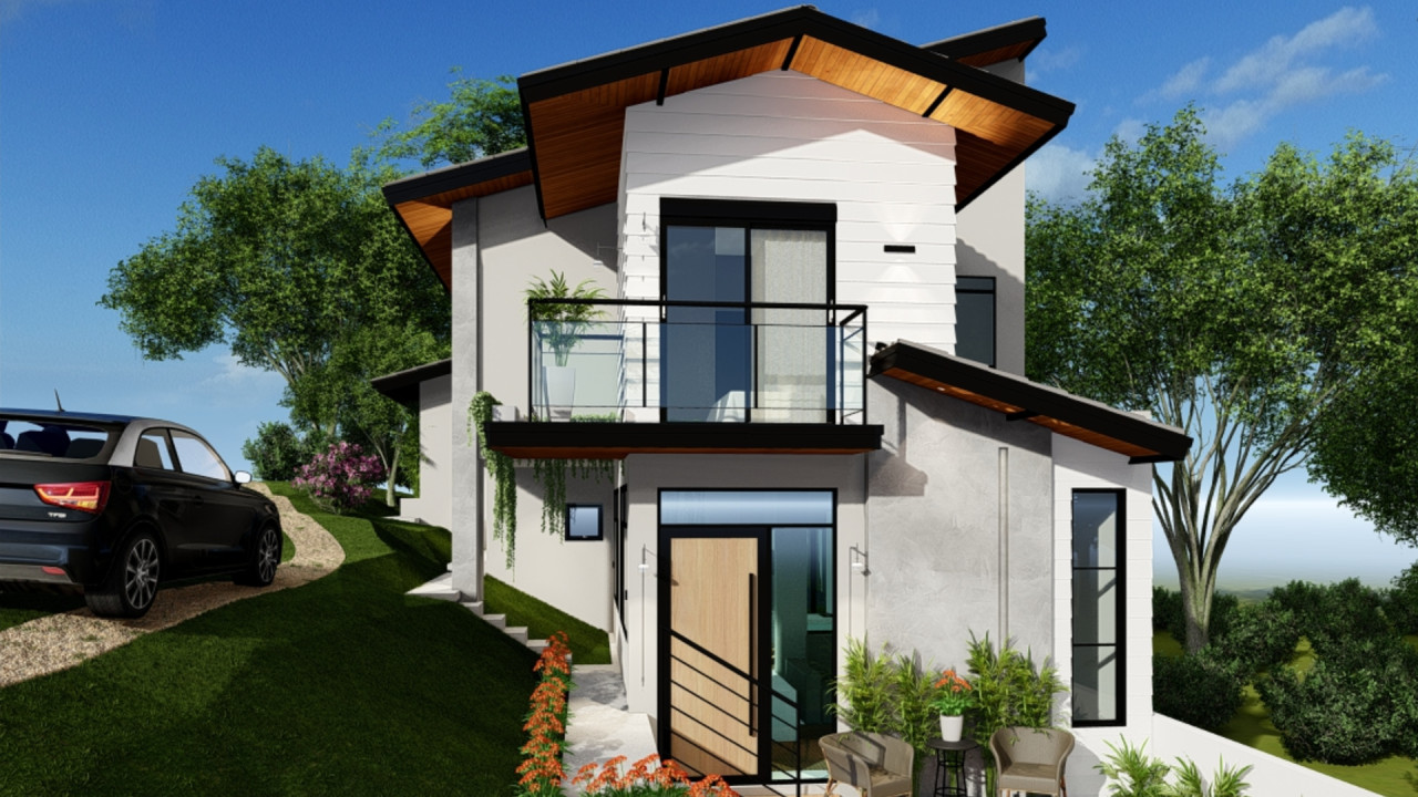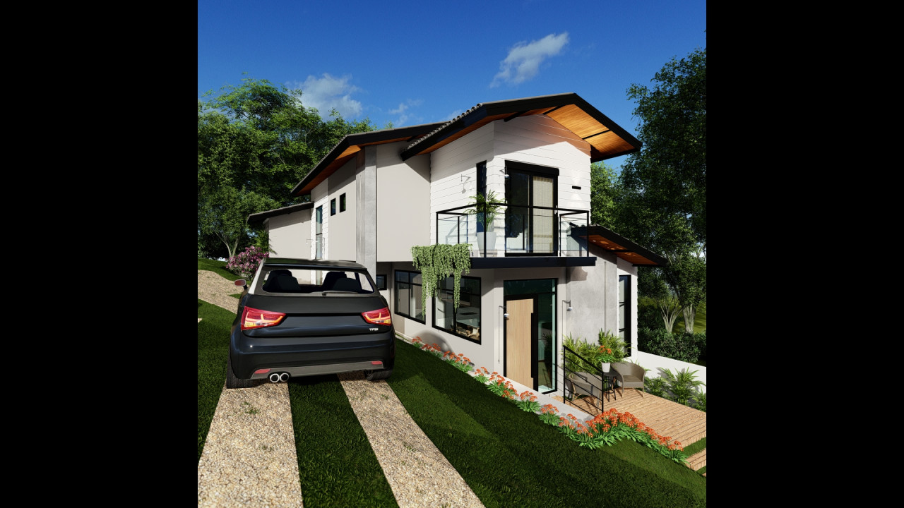 Uma casa em um terreno com declive bem acentuado, com estilo de fachada americana e aproveitamento do desnivelamento para diferentes pavimentos da casa. Área construída de 152,28m² - Projeto de Arquitetura e Engenharia - 2025