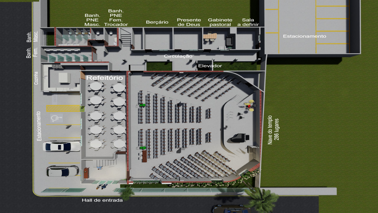 Reforma do complexo da Igreja Presbiteriana em Barreiras - BA com construção de novo templo e adaptação dos ambientes existentes transformando em salão social, s,alas de aula e ambientes de apoio. Complexo com 1.068,30m². Projeto de arquitetura - 2024